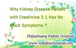 Why kidney disease patient with creatinine 2.1 has no much symptoms ? Because kidney disease is one kind of chronic progressive disease so generally speaking, patient will not have any discomfort at the early stage.
